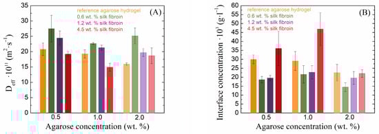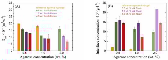 Values of effective diffusion coefficients (A) and theoretical concentrations at the hydrogel interface (B) of methylene blue for silk fibroin-modified agarose hydrogels.