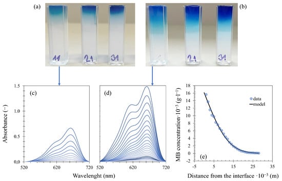 Experimental setup and analysis of diffusion from a constant source: hydrogel samples after 24 (a) and 72 (b) hours of methylene blue diffusion, collected spectra of selected (0.5 wt. % agarose with 0.6 wt. % fibroin) samples (c) and (d), and (e) concentration profile from (d) fitted by Equation (3).