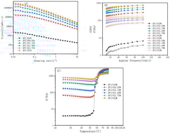 The shear rate ranged from 0.01 s−1 to 10 s−1, the viscosity of the emulsion gel decreased with an increasing shear rate, and the emulsion gel showed typical pseudoplastic fluid characteristics []. Different concentrations of CG showed similar effects on the emulsion gel’s viscosity, and shear thinning behavior was observed at all concentrations possibly because the gel network structure in the emulsion was destroyed by shear force. Moreover, droplet migration resistance was reduced, and this effect prevented the dispersion and aggregation of oil droplets and decreased the apparent viscosity []. At the same shear rate, compared with the 0% CG/SPI emulsion gel, the emulsion gel with a higher CG concentration had higher viscosity, and the 2% CG/SPI emulsion gel had the highest viscosity possibly due to the cross-linking of CG and SPI after heating. This process increased the viscosity of the gel network structure and, thus, reduced the degree of shear thinning [].
