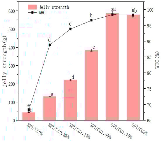 The gel strength can directly reflect the gelling degree of a complex gel, is a key index for evaluating the gel structures of proteins and protein-based products, and is closely related to the WHC. As shown in Figure 2, the gel strength and WHC increased first and then decreased with an increasing CG concentration. The gel strength increased from 43.67 g to 586.91 g, and the highest gel strength of the emulsion gel (586.91 g) was obtained at a 1.75% CG concentration. The presence of polysaccharides could affect the microstructure and texture properties of the gel, which might be related to an exclusion effect of incompatible biopolymers in a mixed solution []. Moreover, an increase in the CG concentrations led to the increase in hydrogen-bonding groups, thus enhancing the internal network structure of the emulsion gels.
