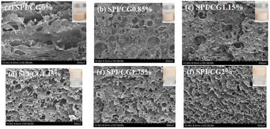 The appearance and scanning electron microscopy (SEM) images of emulsion gels with different concentrations of cassia bean gum. (a) SPI/CG 0%: soy protein isolate, no cassia bean gum added, (b) SPI/CG 0.85%: SPI + 0.85% cassia bean gum, (c) SPI/CG 1.15%: SPI + 1.15% cassia bean gum, (d) SPI/CG 1.45%: SPI + 1.45% cassia bean gum, (e) SPI/CG 1.75%: SPI + 1.75% cassia bean gum, and (f) SPI/CG 2%: SPI + 2% cassia bean gum.