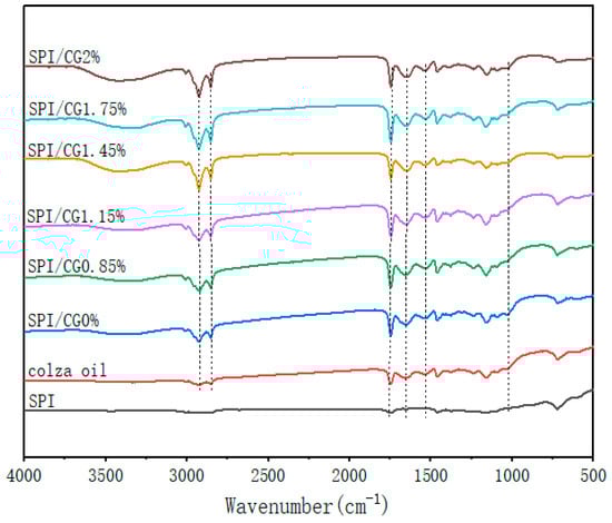 FTIR spectra of emulsion gels with different concentrations of cassia bean gum. SPI: pure soy protein isolate solution; SPI/CG 0%: soy protein isolate, no added cassia bean gum; SPI/CG 0.85%: SPI + 0.85% cassia bean gum; SPI/CG 1.15%: SPI + 1.15% cassia bean gum; SPI/CG 1.45%: SPI + 1.45% cassia bean gum; SPI/CG 1.75%: SPI + 1.75% cassia bean gum; SPI/CG 2%: SPI + 2% cassia bean gum.