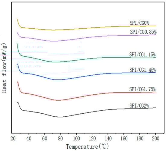 The influence of DSC on the thermal properties of the cassia bean gum emulsions of different concentrations was studied. The absorption peak on the thermal characteristics curve of the 0% CG/SPI emulsion gel was not obvious (Figure 5), and the denaturation temperature was 69.25 °C. As the CG concentration increased, the absorption peaks on the thermal characteristic curves of the cassia bean gum emulsion gels were evident at 69–81 °C, which was the denaturation temperature range of the emulsion gel. The absorption peak gradually moved to the right, and the denaturation temperature increased. When the CG concentration was 2%, the denaturation temperature of the emulsion gels reached 80.66 °C possibly because the interaction between cassia bean gum at a high concentration and SPI was strengthened, the oil–water interface area increased, and a stable emulsion gel structure formed. The complete denaturation of the emulsion gel required an increase in the heat absorption rate, thus improving the thermal stability of the gels [].
