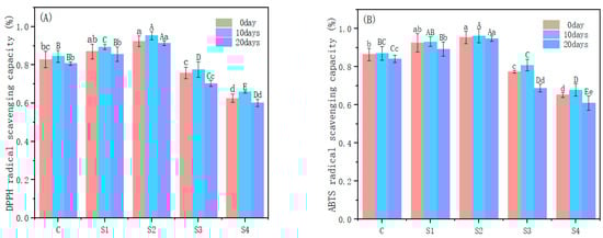 DPPH (A) and ABTS (B) free radical clearance of meat sausage during storage with different fat replacement amounts. C stands for (emulsion gel 1.75% CG/SPI) minced sausage with 0% fat replacement; S1 represents (emulsion gel 1.75% CG/SPI) meat sausage with 25% fat replacement; S2 stands for (emulsion gel 1.75% CG/SPI) minced sausage with 50% fat replacement; S3 stands for (emulsion gel 1.75% CG/SPI) minced meat with 75% fat replacement; S4 stands for (emulsion gel 1.75% CG/SPI) meat sausage with 100% fat replacement. Different letters indicate significant differences in the data (p < 0.05).