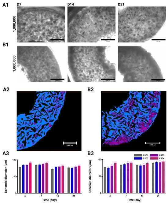 To deepen our understanding of the molding effect that the hydrogel’s morphology has on the aggregation process of cells, we assessed the evolution of the spheroid average diameter as a function of the initial CSD and culture conditions (Figure 2(A3,B3)).
