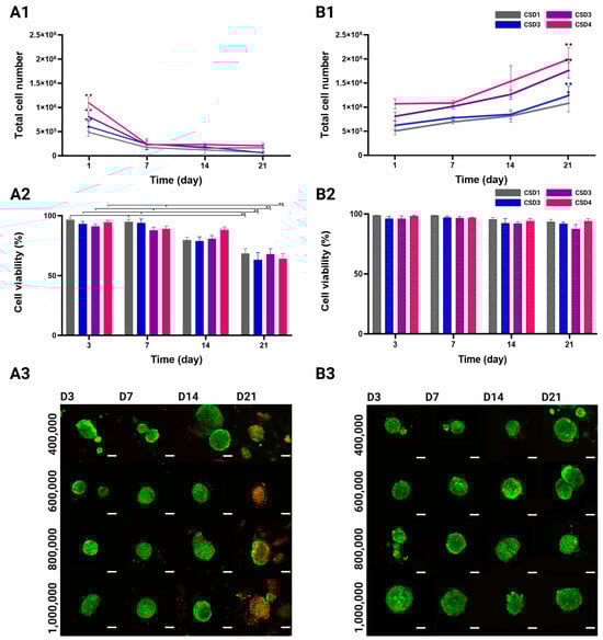 Total number of cells in MSC/HUVEC co-culture over 21 days. (A1) Hydrogels in static culture conditions, and (B1) in dynamic culture conditions. Evolution of MSC/HUVEC viability (mean + SEM %) using a LIVE/DEAD kit. Cells were cultured in (A2) static conditions N = 224, and (B2) dynamic conditions. Cell cultures were conducted with CSD1 (400,000 cells/hydrogel scaffold), CSD2 (600,000 cells/hydrogel scaffold), CSD3 (800,000 cells/hydrogel scaffold), and CSD4 (1,000,000 cells/hydrogel scaffold); dynamic culture results are represented with a pattern (░). * and ** denote p < 0.05 and p < 0.01, respectively. 2D representative projections of confocal z-stack acquisitions showing the distribution of viable cells (calcein-AM, green) and dead cells (ethidium homodimer-1, red) in the co-culture spheroids under (A3) the static culture conditions, and (B3) the dynamic culture conditions. Scale bar = 100 µm.