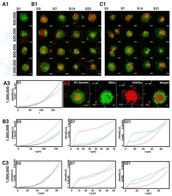 2D representative projections of confocal z-stack acquisitions showing the cellular reorganization of the HUVECs stained with PKH-26 (red) and the MSCs stained with PKH-67 (green) in co-culture spheroids (A1) 24-h post-seeding, under (B1) static, and (C1) the dynamic conditions. Scale bar = 100 µm. (A2) the MSCs/the HUVECs spheroid (2D confocal microscopy) after 7 days of dynamic cell culture condition (left). Object-oriented analysis (right). Ripley’s K function describes the spatial distribution of the MSCs (in green) and the HUVECs (in red) with CSD4 (1,000,000 cells/hydrogel scaffold) compared to a random Poisson distribution (in black) (A3) 24-h post-seeding, under (B3) static cell culture conditions; under (C3) dynamic cell culture conditions.