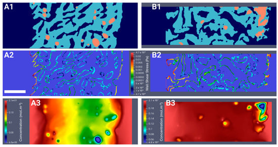 To better understand the biomechanical environment experienced by spheroids in a perfusion bioreactor, we computed the WSS. Indeed, the force exerted by fluid flow on the cell surface can significantly influence cell behavior, including proliferation, differentiation, and alignment []. Segments of hydrogels seeded with the highest and lowest cell densities, CSD1 and CSD4, and sampled on day 1 and day 21 were digitally reconstructed (Figure 5(A1,A2) and Figure S2(A1,A2)). These densities were selected to represent the least and most populated scenarios of hydrogel scaffolds. The perfusion flow was simulated in 3D using LBM. The WSS applied by the fluid to the pore walls, the inner and outer edges of the scaffold, and the internal surface of the bioreactor were measured. The average WSS values on the peripheries of the hydrogel varied between 0.19 mPa on day 1 and 0.28 mPa on day 21 for CSD1 (S2(A2, B2)) and between 0.3 mPa on day 1 and 0.19 mPa on day 21 for CSD4 (Figure 5(A2,B2)). At the pore level, the average WSS values remained inferior to 1 mPa. These values are physiologically negligible compared to those reported in the literature and could be insufficient to induce any significant behavioral changes in the cells at any point in the hydrogel [,,].