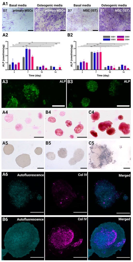(A1) Representative ALP staining test comparing the osteogenic differentiation capacity of the MSC-IST and the primary MSCs on day 7 of the culture. Scale bar = 500 µm. Standardized ALP expression (nmol/min/µg, mean + SEM) throughout the culture period under (A2) the static conditions and (B2) the dynamic conditions. The cell culture was conducted with CSD1 (400,000 cells/hydrogel scaffold), CSD2 (600,000 cells/hydrogel scaffold), CSD3 (800,000 cells/hydrogel scaffold), and CSD4 (1,000,000 cells/hydrogel scaffold); dynamic culture results are represented with a pattern (░). *, **, and *** denote p < 0.05, p < 0.01, and p < 0.001, respectively. 2D representative projections of confocal z-stack acquisitions showing ALP live stain in co-culture spheroids under (A3) static culture conditions and (B3) dynamic culture conditions on day 7 with CSD4 (1,000,000 cells/hydrogel scaffold). Scale bar = 100 µm. Alizarin red staining of co-culture spheroids on (A4) day 1, and day 21 under (B4) the static conditions and (C4) the dynamic conditions with CSD4. Scale bar = 300 µm. Von Kossa staining of co-culture spheroids on (A5) day 1, (B5) day 21 under the static conditions, and (C5) the dynamic conditions with CSD4. Scale bar = 100 µm. 2D projections of confocal z-stack acquisitions showing the staining of collagen IV (magenta) in co-culture spheroids under (A6) static culture conditions and (B6) dynamic culture conditions on day 21 with CSD4. Scale bar = 100 µm.