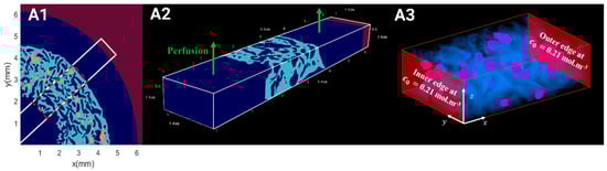 We investigated oxygen transport as a possible factor driving the differences between the spheroids cultured in the static or the dynamic conditions. Using 3D reconstructed segments of seeded hydrogels (Figure 5(A1,B1)), oxygen transport was simulated at the beginning and the end of the culture for the lowest and highest densities. At the scaffold level, the dissolved oxygen concentration was 2.1-fold higher in regions closer to the periphery than to the center (Figure 5(A3,B3) and Figure S2(A3,B3)), coinciding with regions of higher cell proliferation. More specifically, at the spheroid level, the decrease in dissolved oxygen concentration between the outermost and innermost cell layers could reach 98%. Approximately only 0.01% to 5.40% of cells within the hydrogel were subjected to hypoxic conditions, defined as c < KM = 3.8 × 10−3 mol.m−3. These hypoxic conditions primarily affected the cells located in the spheroid core, which was predominantly endothelial, with the extent of hypoxia, or oxygen transport in general, varying based on the spheroid’s size and location and the density of the neighboring spheroids. The spatial response described earlier can be a unique feature of the HUVEC CRL 1730 line within the bounds of our experimental design. Cell lines may possibly possess different thresholds of the oxygen gradient, and many other factors, compared to primary cells, which are better conditioned to tolerate harsher hypoxic conditions than those calculated in this study.