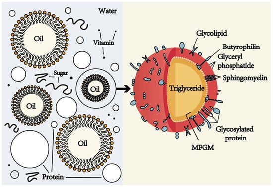 In milk, lipids account for about 3.5–5.2% of its total composition, mainly composed of triglycerides, accounting for more than 98% of the total lipids of milk, and the remaining, approximately 2%, of milk fats can be subdivided into different subcategories, mainly including diglycerides, monoglycerides, free fatty acids, phospholipids, and cholesterol []. The triglycerides in milk are in the form of MFGM-encapsulated spherical droplets, also known as milk fat globules. Structurally, milk fat globules are formed by a triglyceride-based core and surrounded by MFGMs with a three-layer structure, where MFGMs are composed of phospholipids, sphingolipids, cholesterol, glycoproteins, and enzymes [] (Figure 1). MFGM plays a key role in the physical stability of triglycerides in milk because, as a natural emulsifier, it is able to form an interfacial adsorption layer on the surface of the lipid droplets, reducing the physical attraction between fat globules and reducing their tendency to aggregate, thereby reducing the flocculation and coalescence of fat globules [,,]. In addition, MFGM can also protect fat globules from the action of lipase and slow down the decomposition of milk fat, because the MFGM membrane can act as a physical barrier to block the contact between lipase and fat globules, and MFGM also contains lipase inhibitors, which can slow down the action of lipase, thereby delaying the hydrolysis process of fat [,,,,].