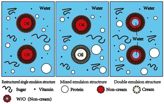 In addition, most of the fat in fresh milk can be removed by physical methods, such as high-speed centrifugation, and skim milk can be obtained. Skim milk is easy to store because it contains almost no fat, is less prone to oxidation, and is also beneficial for lowering cholesterol, blood pressure and triglycerides. However, skim milk does not taste as good as whole milk, and fat-soluble substances (vitamins A, D, E, K) are lost during the skimming process. Therefore, there are also a small number of studies on the structural remodeling of skim milk, mainly by introducing a small amount of another oil/bubble into skim milk to obtain milk with a restructured single emulsion structure, in order to improve the taste and nutritional value of skim milk (Figure 2). For example, the replacing of fat globules with bubbles in acidified milk matrices has been studied to develop better-tasting and low-fat products [].