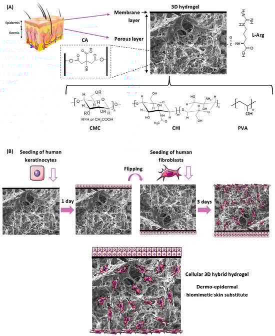 Hence, in this study, a novel type of biocompatible ternary hybrid hydrogel scaffold was designed, developed, and produced through an entirely eco-friendly aqueous process. The matrix of the hydrogel was composed of carboxymethyl cellulose, chitosan, and polyvinyl alcohol and chemically cross-linked by citric acid; this was followed by a freeze-drying process and biofunctionalization with L-arginine amino acid. In addition, a dermo-epidermal skin biomimetic substitute was obtained based on human-derived cell cultures of fibroblasts and keratinocytes seeded and grown onto these 3D matrices to produce cell-based responsive bio-hybrid hydrogel scaffolds to potentially assist in the wound healing process. These bio-hybrids were comprehensively investigated for their physicochemical, morphological, structural, and biological characteristics to act as 3D porous scaffolds for cell support and delivery assayed using in vivo mice models.