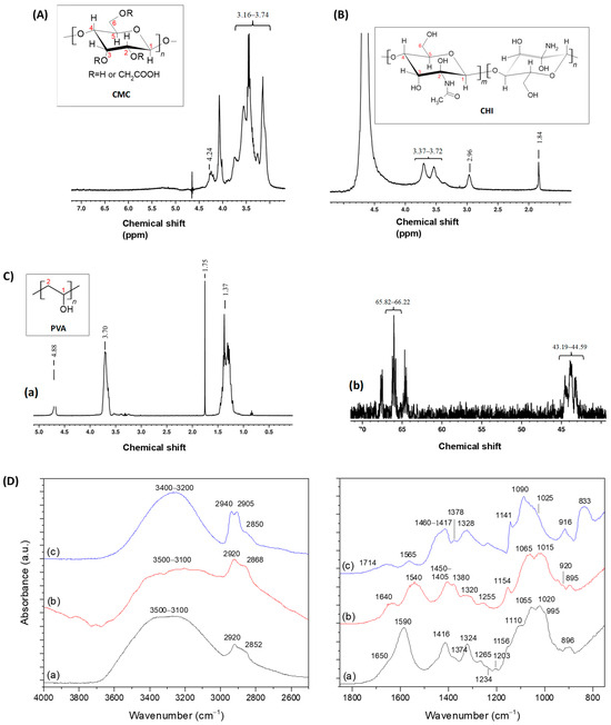 Nuclear Magnetic Resonance (NMR) combined with Fourier-transform infrared spectroscopy (FTIR) techniques were employed to elucidate the chemical structure of the polymeric precursors. The sensitivity of NMR depends on factors such as the chosen nucleus, its abundance, and the chemical environment of the sample [38]. For CMC and CHI, 1H NMR was selected because of the high abundance of hydrogen nuclei, ensuring appropriate sensitivity for analysis. In the case of PVA, 13C NMR was also performed. Figure 2A–C shows the NMR spectra of CMC, CHI, and PVA, respectively.