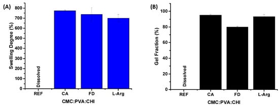 Results of (A) swelling degree (SD) and (B) gel fraction (GF) for 3D structures produced during different processing stages. Sample identification: REF refers to sample without citric acid (CMC:PVA:CHI); CA is the sample chemically cross-linked with citric acid (CMC:PVA:CHI_CA); FD is the cross-linked ternary hybrid hydrogel after the freeze-drying process (CMC:PVA:CHI_FD); and L-Arg is the cross-linked and freeze-dried sample after biofunctionalization with L-arginine (CMC:PVA:CHI_L-Arg).