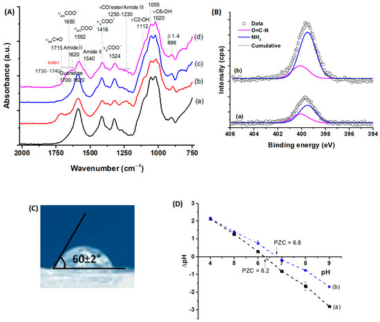 (A) FTIR spectra (range 2000–750 cm−1) for the samples: (a) CMC:PVA:CHI (REF), (b) CMC:PVA:CHI_CA, (c) CMC:PVA:CHI_FD, and (d) CMC:PVA:CHI_L-Arg. (B) XPS spectra of N 1s region for hydrogels: (a) CMC:PVA:CHI_FD and (b) CMC:PVA:CHI_L-Arg. (C) Surface wettability assessment of the 3D hydrogel CMC:PVA:CHI_L-Arg through contact angle measurement. (D) PZC studies for the samples: (a) CMC:PVA:CHI_FD and (b) CMC:PVA:CHI_L-Arg.
