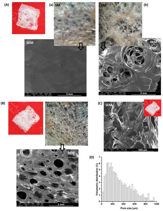 Digital images (red background), stereoscopic microscope images (SM, 20×), and scanning electron microscopy images (SEM, 50×–100×) of the (A) upper and (B) lower surfaces of the porous three-dimensional structure. (C) SEM image (200×) of cross-section (Section A-A in the detail of the digital image). (D) Volumetric pore size distribution by micro-CT.