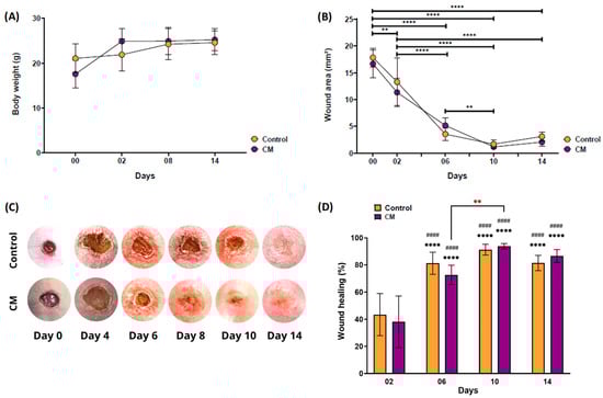 (A) Monitoring of the body weight of the mice after inducing skin lesions and applying a cell membrane (CM group) compared to the control group (without membrane). (B) Measurement of the wound area over 14 days for both the cell membrane and control groups. (C) Representative photos showing the wound healing process during the days of the experiment and (D) percentage of wound healing (WHR, %). The control group consisted of healthy female Hairless mice (n = 8), with their wound covered by a “Blood stop” bandaid but with no membrane applied. The CM group included Hairless mice with wounds covered by the tested cell membrane (CM, n = 8). In the graph plot D, (*) indicates statistical differences where all groups on days D06, D10, and D14 were compared to the control group on day D02. (#) Indicates statistical difference where all groups on days D06, D10, and D14 were compared to the membrane-treated (CM) group on day D02. The red asterisk represents the statistical difference between the membrane-treated groups (CM) at D06 and D10. Data are shown as mean ± standard deviation. **/## p < 0.01; ****/#### p < 0.0001.
