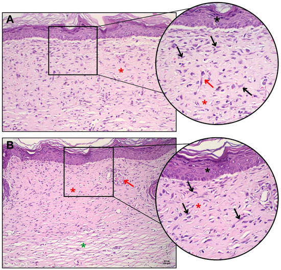 Histopathological analysis of skin lesions in Hairless mice, showing representative images of (A) skin from the control group (no hydrogel applied) and (B) skin from the group treated with the 3D bilayer construct containing fibroblasts and keratinocytes (CM group). Black asterisk: intact epidermis; red asterisk: denser collagen; green asterisk: looser collagen; black arrow: reactive fibroblasts; red arrow: blood capillaries. The larger image displays the lesion area at 20× magnification, with a zoomed-in view of the highlighted area at 40× magnification.