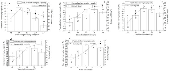 Effects of ultrasonic time (a), liquid–solid ratio (b), ethanol concentration (c), extraction temperature (d), and extraction time (e) on free radical scavenging capacity and extract yield of AVE. (The different letters A–D marked in the bar chart indicated significant differences in the results of free radical scavenging capacity (p < 0.05); The different letters a–e marked in the line indicated significant difference in extraction yield (p < 0.05)).