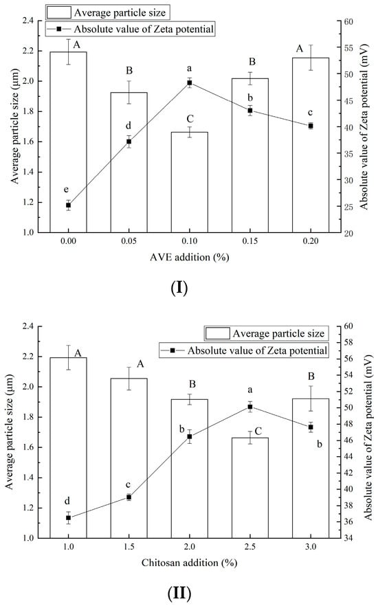Effects of addition of AVE (I), chitosan (II), and xanthan gum (III) on particle size and absolute value of Zeta potential of Pickering emulsion oleogel (in the figure (I), a–e represent 0, 0.05%, 0.1%, 0.15%, and 0.2% additions of AVE, respectively. In the figure (II), a–e represent 1.0%, 1.5%, 2%, 2.5%, and 3% additions of chitosan, respectively. In the figure (III), a–e represent 0%, 0.15%, 3%, 0.45%, and 0.6% additions of xanthan gum, respectively). (The different letters A–C marked in the bar chart indicated significant differences in the results of average particle size (p < 0.05); The different letters a–e marked in the line indicated significant difference in absolute value of Zeta potential (p < 0.05)).
