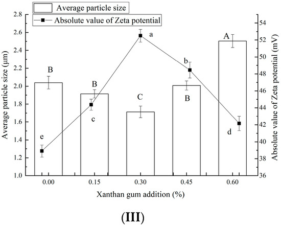 According to Figure 2III, with the increase in xanthan gum addition, the particle size of the composite system first gradually decreased and then significantly increased, while the absolute value of Zeta potential first increased and then decreased (p < 0.05). This showed that the addition of an appropriate amount of xanthan gum was conducive to the stability of the system, because xanthan gum had strong emulsifying stability and a high suspension stability effect, and the hardness and viscosity of the system were significantly increased [25]. However, the excessive addition of xanthan gum would have had a negative impact on the stability of the system, which may be because the viscosity of xanthan gum increased, resulting in insufficient emulsification of the cell crusher [26]. When the amount of xanthan gum was 0.3%, the oleogel particle size had the minimum value, and the absolute value of Zeta potential was the maximum. This indicated that the particle size distribution of the composite system was relatively uniform and stable when the addition of xanthan gum was 0.3%. This may be because the addition of xanthan gum increased the net charge of the emulsion drops, enhanced the electrostatic repulsion between the droplets, and increased the stability of the emulsion [27]. Single protein-based nanocapsules tend to aggregate under common food processing conditions, resulting in poor stability, while polysaccharides can inhibit the aggregation and precipitation of proteins by providing electrostatic repulsion and steric hindrance, making the system more environmentally sensitive [28]. Krstonošić et al. [27] also confirmed that the complex nanocarrier matrix formed by the interaction of protein and polysaccharide may help to further improve the protective effect and bioavailability of bioactive substances.