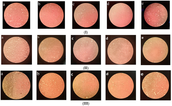 Effects of addition of AVE (I), chitosan (II), and xanthan gum (III) on microstructure of Pickering emulsion oleogel (200×). (In the figure (I), a–e represent 0, 0.05%, 0.1%, 0.15%, and 0.2% AVE additions, respectively. In the figure (II), a–e represent 1.0%, 1.5%, 2%, 2.5%, and 3% chitosan additions, respectively. In the figure (III), a–e represent 0%, 0.15%, 3%, 0.45%, and 0.6% xanthan gum additions, respectively.)