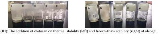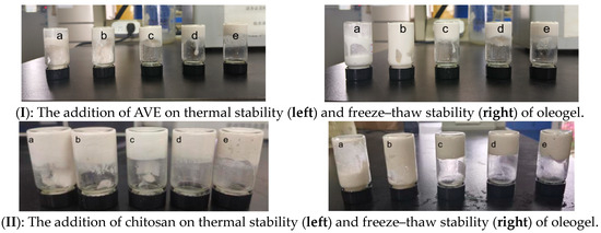 As can be seen from Figure 4II (left), the thermal stability of the oleogel was improved with the increasing addition of chitosan in the range of 1~2.5%. When the added amount of chitosan was lower than 2%, the oleogel (a–c sample) broke and deformed, and obvious oil leakage occurred. However, when the addition of chitosan reached more than 2.5%, the oleogel after heating was inverted and did not flow and had certain plasticity. As can be seen from Figure 4II (right), after freeze-thawing, the oleogels of sample a and sample b with low added amounts of chitosan correspondingly had obvious oil leakage. When the mass fraction of chitosan reached more than 2%, the oleogels of sample c, d, and e all had relatively good freeze–thaw stability, among which, sample d had better stability from the image. This result indicated that the increase in chitosan can improve the thermal stability and freeze–thaw stability of the oleogel, which was speculated to be due to the fact that in addition to its network formation ability, chitosan can also adsorb on the ovalbumin interface to form a double-layer interface to enhance the interface stability [9]. Therefore, the strength of the interaction between chitosan and ovalbumin was crucial for the stability of the oleogel. In the emulsion, the interaction between chitosan and ovalbumin was mainly mediated by hydrogen bonds [30], which further improved the stability of the prepared oleogel.