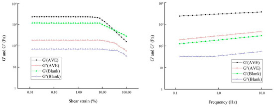As can be seen from Figure 5, the G′ values of the AVE group and the blank group were always greater than G″, indicating that a gel structure had been formed, and the linear viscoelastic region of the oleogel was longer, indicating that its structure was not easily damaged by external forces and had good remodelability. When AVE was added to the oleogel system in the experimental group, G′ was significantly higher than that in the blank control group, indicating that the addition of AVE enhanced the gel properties of the oleogel. With the increase in frequency, the modulus value of the oleogel did not change significantly, indicating that the oleogel had good solid-like characteristics and the interior was composed of non-covalent physical cross-linking [35].