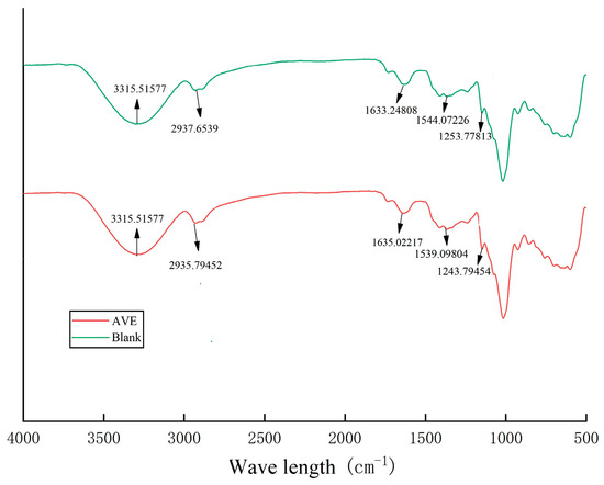 Fourier infrared spectrum of oleogel (AVE: the AVE–ovalbumin/chitosan/xanthan Pickering emulsion oleogel; blank: the ovalbumin/chitosan/xanthan Pickering emulsion oleogel without AVE).