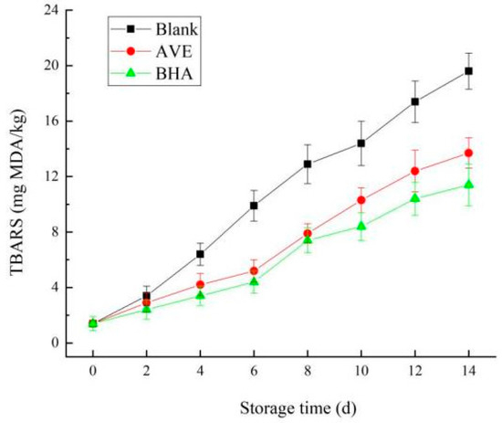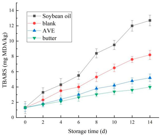 In order to investigate the effect of AVE on the oxidation stability of oleogel, the oleogel without AVE was used as a blank control group, and the oleogel with 0.1% BHA as a positive control group (BHA group) was used to detect the oxidation of oleogel during 14 days of storage. As shown in Figure 7, with the extension of storage time, the TBARS of the three groups all showed an increasing trend, and the increasing rate of TBARS in the blank group was significantly higher than that in the AVE and BHA groups. It can be seen from the figure that the addition of AVE and BHA could more effectively delay the oxidation of oil in the oil gel system. On the whole, although the antioxidant effect of AVE was slightly inferior to that of BHA, the AVE group still showed an antioxidant effect close to that of BHA in the early stage of storage (0–8 d), but the MDA formation may have been accelerated in the later stage of storage (8~14 days) due to the continuous dissolution and oxidation of fats in the oleogel.