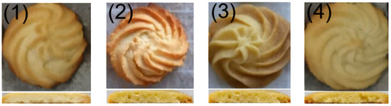 Appearance and cross-section of each sample ((1–4): cookies prepared with soybean oil, oleogel without AVE (blank), experimental oleogel (AVE), and butter, respectively).