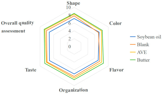 The appearance and cross-section of each samples are shown in Figure 8, and the sensory score is shown in Figure 9. There were no significant differences in the scores of morphology, color, flavor, texture, taste, and overall quality assessment of the samples. Overall, the liquid soybean oil scored the lowest, the butter group scored the highest, and the blank group was lower than the AVE group, and although the AVE group did not score as high as the butter group, the difference was not significant.
