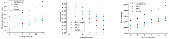 Effect of the oleogels on texture of cookies during storage. (A): Deformation distance, (B): cohesion, (C): hardness (soybean oil: cookies prepared with soybean oil; blank: cookies prepared with the oleogel, but no AVE; AVE: cookies prepared with the AVE–oleogel; butter: cookies prepared with butter).
