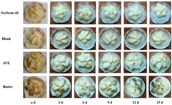Effect of the oleogels on the appearance of the cookies during storage (soybean oil: cookies prepared with soybean oil; blank: cookies prepared with the oleogel, but no AVE; AVE: cookies prepared with the AVE–oleogel; butter: cookies prepared with butter).