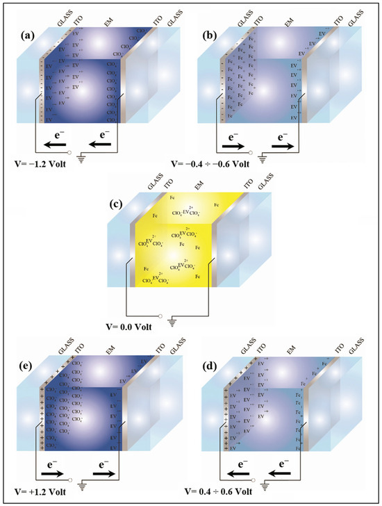 Schematic representation of electrochromic device at different applied voltages: −1.2 V (a), between −0.4 and −0.6 V (b), 0 V (c), between 0.4 V and 0.6 V (d) and 1.2 V (e) (Fc indicates 1,1′-diethyl ferrocene, EV is ethyl viologen).