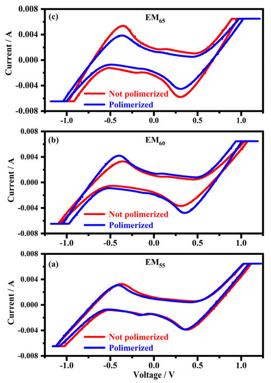 Cyclic voltammograms collected on the samples filled with the electrochromic gel mixtures at the weight ratios of 55% (a), 60% (b) and 65% (c), indicated as EM55, EM60 and EM65 with the bisphenol A not-polymerized (red line) and polymerized (blue line).