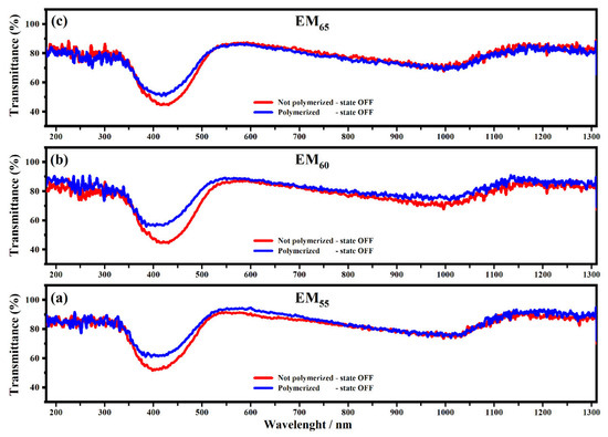 Transmittance spectra collected on the devices filled with the electrochromic gel mixtures: EM55 (a), EM60 (b) and EM65 (c), not-polymerized (red line) and polymerized (blue line), in the state OFF and in the range from 100 nm to 1310 nm at 0 V.