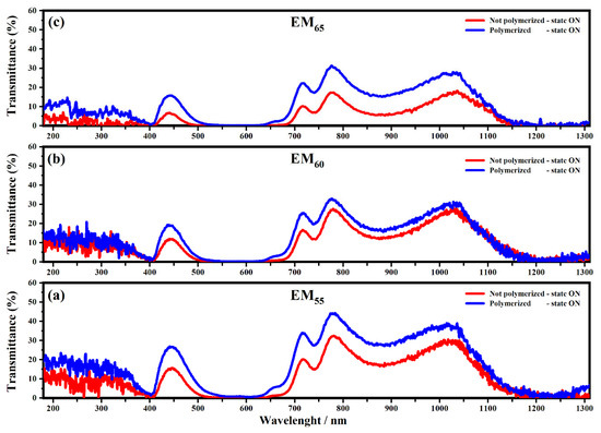 Transmittance spectra collected on the devices filled with the electrochromic gel mixtures: EM55 (a), EM60 (b) and EM65 (c), not-polymerized (red line) and polymerized (blue line), in the state ON and in the range from 100 nm to 1310 nm at 1.2 V.