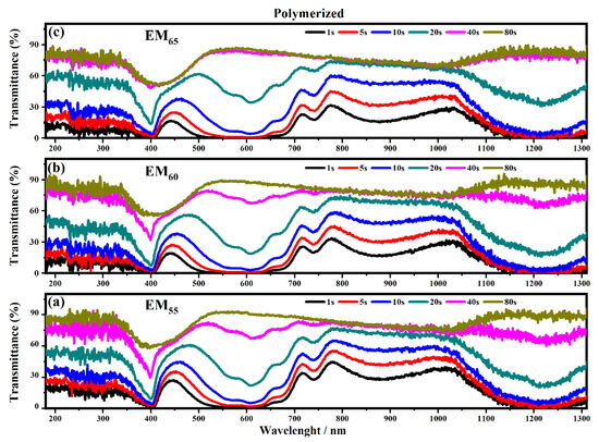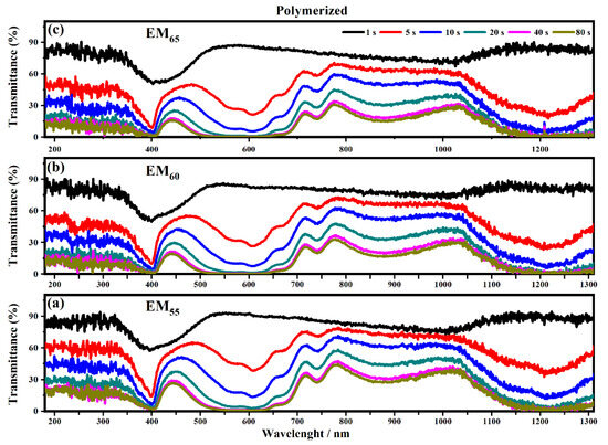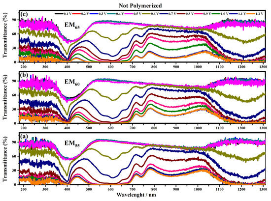 Transmittance spectra collected on the electrochromic devices filled with EM55 (a), EM60 (b) and EM65 (c) polymerized gels under a voltage of 1.2 V to switch OFF the devices.