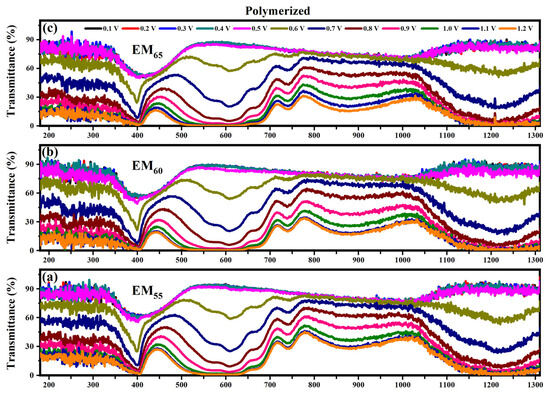 Figure 6 and Figure 7 show the transmittance spectra of the electrochromic devices made using EM55, EM60 and EM65 (containing the not-polymerized and polymerized bisphenol A gels) when each system was in its ON state under an applied voltage from 0.1 V to 1.2 V.