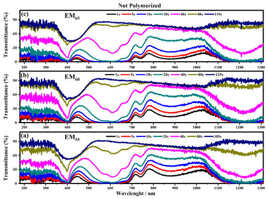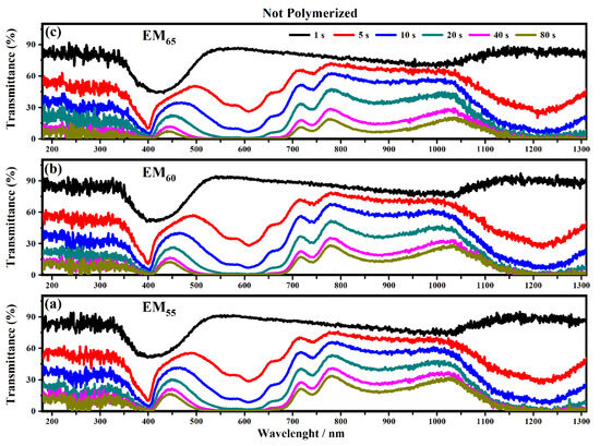 Transmittance spectra collected on the electrochromic devices filled with EM55 (a), EM60 (b) and EM65 (c) not-polymerized gels under a voltage of 1.2 V to switch OFF the devices.