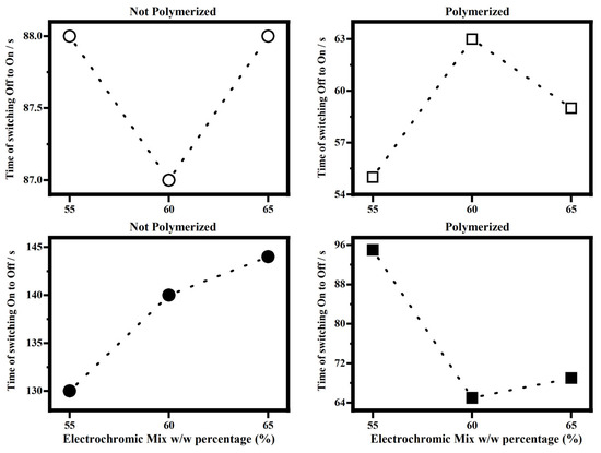 Time of switching OFF/ON and ON/OFF vs. percentage w/w mix of electrochromic/bisphenol A, EM55, EM60 and EM65 gels of the electrochromic devices not-polymerized (on the left) and polymerized (on the right).