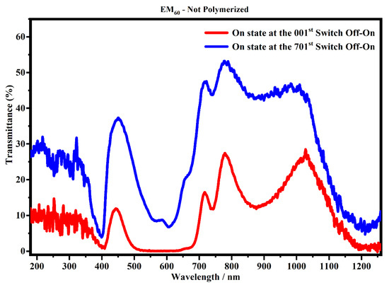 Figure 13 shows that the spectra collected after 700 cycles have a lower transmitance than the spectra collected after one cycle, and in particular, ΔT% at 400 nm, 600 nm and 1205 nm is 3.3%, 6.6% and 6.3%, respectively. This means that the sample could suffer a possible degradation of the gel mixture subjected to an external applied voltage. On the contrary, the system which contains the polymerized EM60 is still stable up to 2000 cycles, as shown in Figure 14. In particular, it can be noticed that the polymerized devices do not exhibit appreciable variation of transmittance in the considered range. The polymerization process and the combination of the gel polymer mixture play a key role in enhancing the life of electrochromic devices.