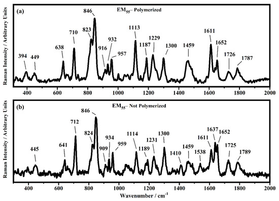 Raman spectra collected in the range between 310 and 2000 cm−1 on the samples EM55 polymerized (a) and not-polymerized (b).