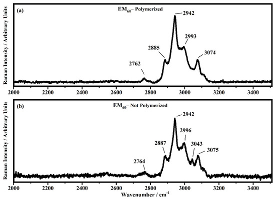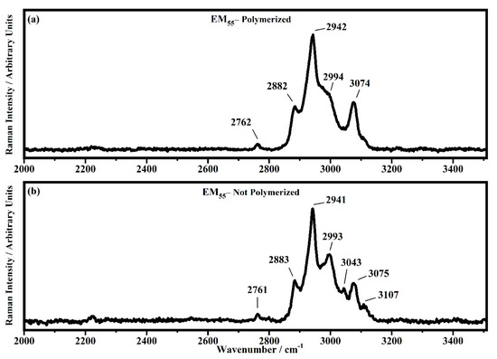 Raman spectra collected in the range between 2000 and 3510 cm−1 on the samples EM60 polymerized (a) and not-polymerized (b).