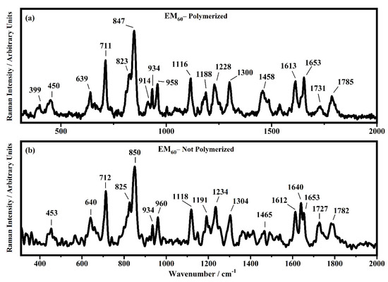 Raman spectra collected in the range between 310 and 2000 cm−1 on the samples EM60 polymerized (a) and not-polymerized (b).