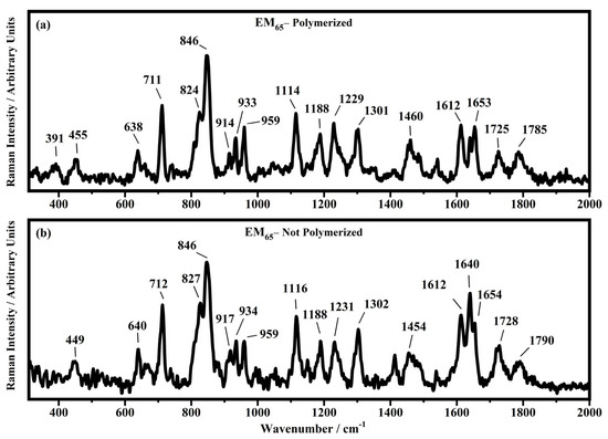 Raman spectra collected in the range between 300 and 2000 cm−1 on the samples EM65 polymerized (a) and not-polymerized (b).