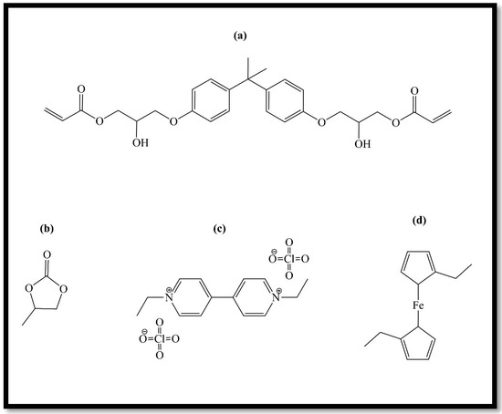 Electrochromic gel chemicals: (a) bisphenol A glycerolate (1 glycerol/phenol) diacrylate, (b) propylene carbonate; (c) ethyl viologen diperchlorate; (d) diethyl ferrocene.