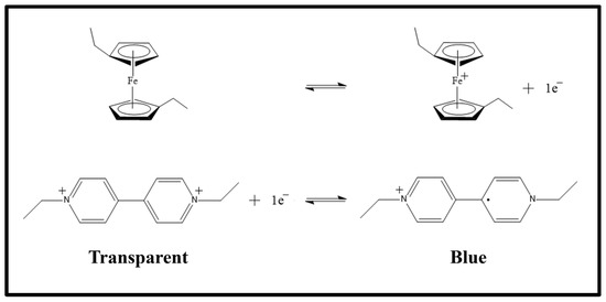 To better understand the schemes of Figure 1, it may be useful to look at Scheme 1, where the electrochromic reaction is drawn. In Scheme 1, the two semi-reactions are shown. In particular, at the top of the scheme, the oxidation of 1,1′-diethyl ferrocene is shown, which frees an electron that is used by the ethyl viologen diperchlorate in its dicationic form during the reduction reaction, at the bottom, which leads to the ethyl viologen diperchlorate radicalic monocationic form.